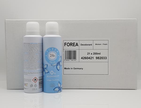Forea Deodorant Women FRESH 200ml - Made in Germany- Woman Deodorant Fresh 0% Aluminium Fraîcheur plus longue Sans micro plastiques Emballage: 21 unités / carton 3024 unités / palette -Fabriqué en Allemagne- Certificat EUR.1 Nous avons toujours plus de 4000 palettes de détergent, savon, déodorant, déodorant à rouleau, gel douche, lotion pour le corps, parfum, pots, vaisselle, épicerie, articles d'hygiène, cosmétiques et sportifs et bien plus encore en stock, qui couvre 3000 mètres carrés. Renseignez-vous simplement sur nos produits actuels. Pour des quantités plus importantes, les prix sont négociables sur place! Les marchandises sont notre propriété, nous ne sommes pas des intermédiaires! Nous vendons toutes les marchandises exclusivement pour l'exportation hors UE! Toutes les marchandises ont un certificat d'origine et un certificat EUR.1. * Nous avons toujours une proposition pour les clients d'Europe! Contactez-nous. * ____________________________________ Nos heures d'ouverture sont de 8h30 à 16h00.