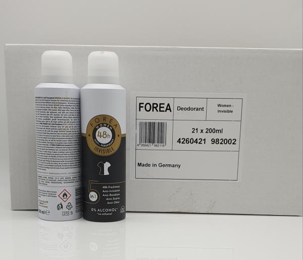 Déodorant Forea Femme Invisible 5 en 1, 200 ml - Fabriqué en Allemagne- Déodorant Femme Invisible 5 en 1 Anti-Transpirant 0% Alcool Anti-Irritation Anti-Résidus Anti-Taches Anti-Odeur Sans Micro plastiques Emballage: 21 unités / carton 3024 unités / palette -Fabriqué en Allemagne- certificat EUR.1 Nous avons toujours plus de 4000 palettes de détergent, savon, déodorant, déodorant à rouleau, gel douche, lotion pour le corps, parfum, pots, vaisselle, nourriture, hygiène, articles cosmétiques et sportifs et bien plus encore Entrepôt, qui couvre 3000 m². Renseignez-vous simplement sur nos produits actuels. Pour des quantités plus importantes, les prix sont négociables sur place! Les marchandises sont notre propriété, nous ne sommes pas des intermédiaires! Nous vendons toutes les marchandises exclusivement pour l'exportation hors UE! Toutes les marchandises ont un certificat d'origine et un certificat EUR.1. * Nous avons toujours une proposition pour les clients d'Europe! Contactez-nous. * ____________________________________ Nos heures d'ouverture sont de 8h30 à 16h00.